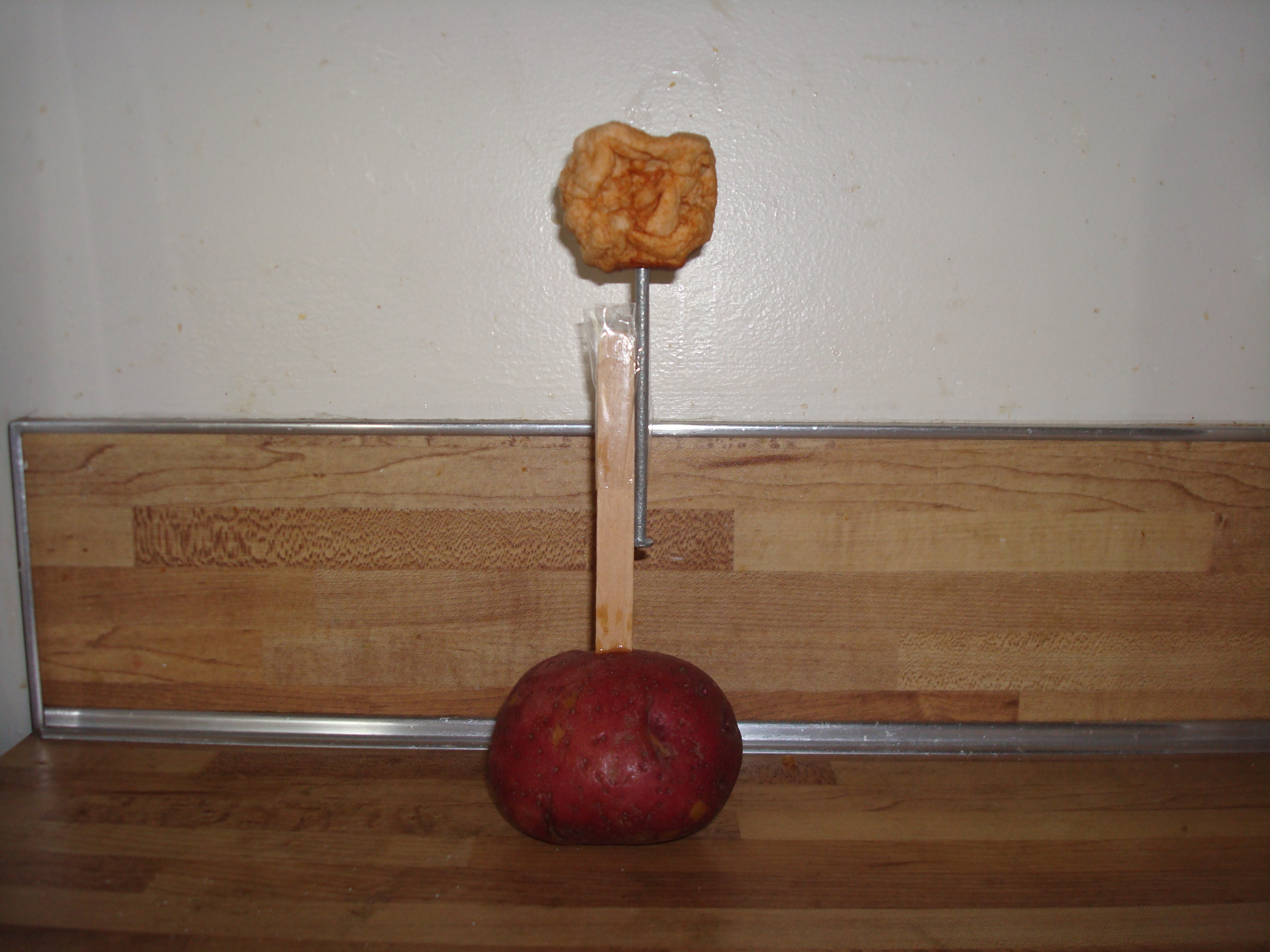I used a popsicle stick and nail that I taped together to create the skeleton. I stuck the sharp end of the nail into the base of the dried apple, and the popsicle stick into a potato.