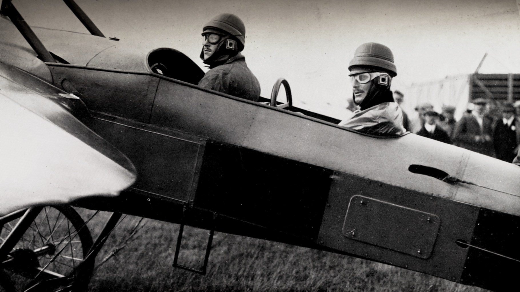 Caption: The pilot is seen seated in a Bleriot monoplane, which is about to start. The mechanics are holding on to the fuselage against the pull of the propeller.Caption: In the photograph, which shows one of the Royal Aircraft Factory’s biplanes, the mechanic has just released the propeller and is getting clear of its rotation.Caption: A view can be seen of the control wheel in front above which is a map holder. On the right is a compass.Caption: A Bleriot monoplane descending and a Farman-type biplane ascending. The biplane is flying away from the camera and the monoplane is approaching from above.