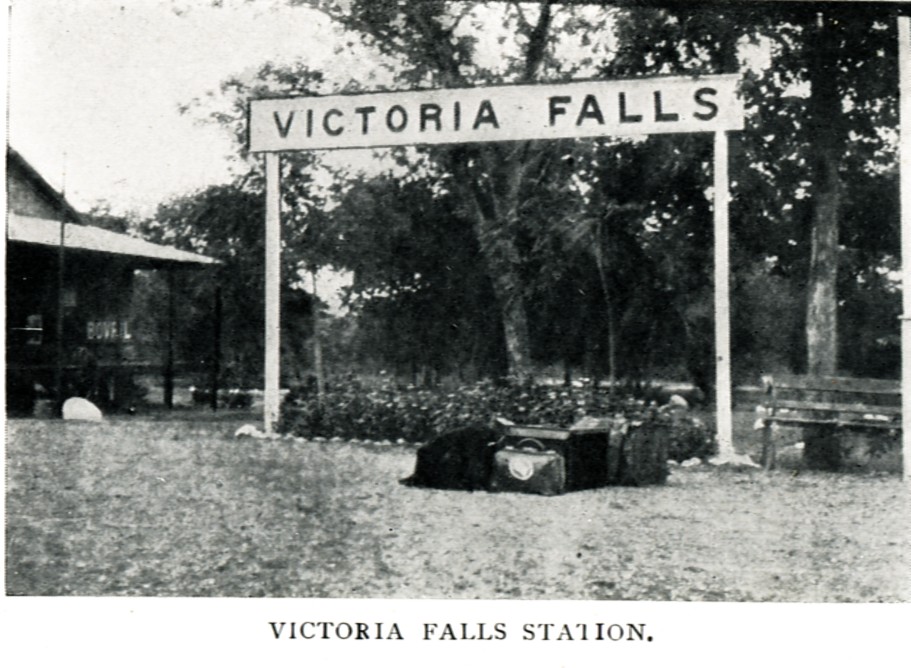 In a short time the train stops in a sort of wood. A small tin station stands close by—and a big white wooden signboard spells: “Victoria Falls.”