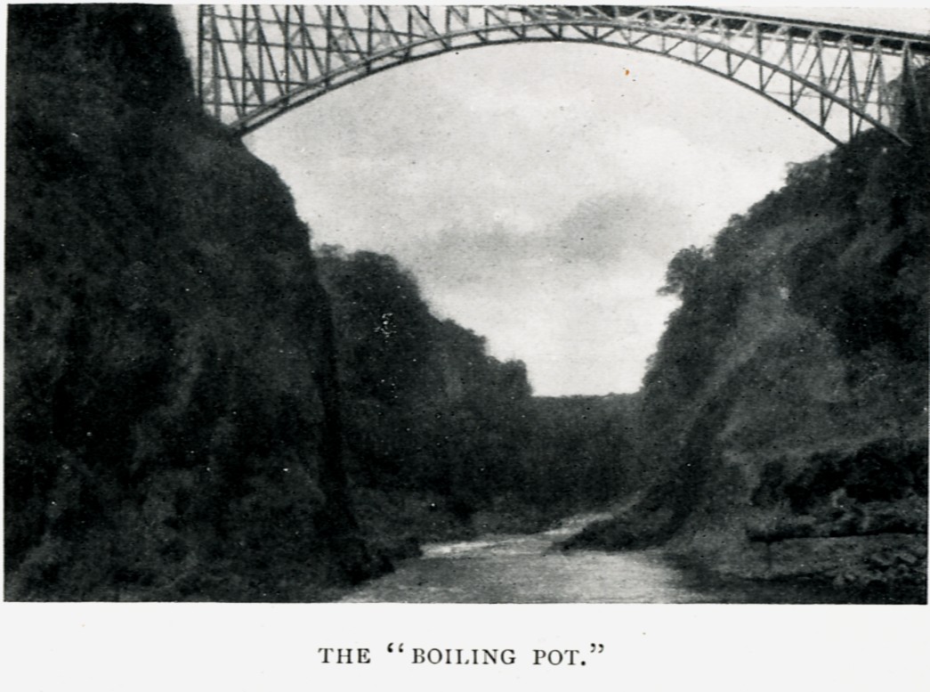 Everywhere are wonderful trees, crystallized into eternal freshness by the mist They crown and decorate well-worn pinnacles of rocks. They you stand on Victoria Bridge. To the left and far below is the dark brown water, churning in what is called the Boiling Pot. The water rushes in, swirls, runs about in impotent anger, having been hurled over a precipice, down 400 feet, and into this maze from which there is no outlet. At last, however, it rushes under the bridge, flows with loud protest, hissing over rocks, and wends its way through deep and narrow channels to its natural bed.