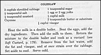 Suffice it to say that I have mixed feelings about Coleslaw. But, I had a cabbage in the refrigerator so when I saw a hundred-year-old recipe for Coleslaw in a home economics textbook I decided to give it a try. The Coleslaw dressing had a very mild flavor with just a hint of sugar and vinegar, which allowed the flavor of the cabbage itself to shine. That said, I prefer Coleslaw dressings with a more pronounced sweet-sour flavor, so I probably won’t make this recipe again.