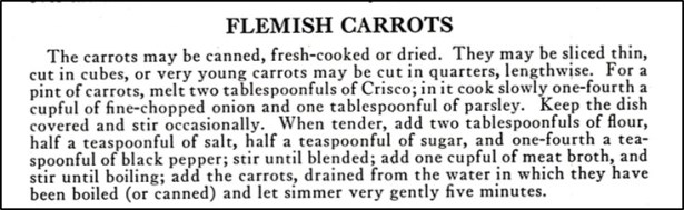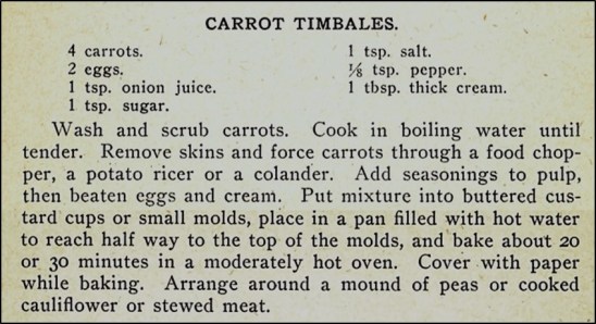 A few recipes in the 1921 edition of The Boston Cooking-School Cook Book have French names. One of those recipes is Macedoine of Vegetables a la Poulette. After googling the words in the name, I think that it roughly translates into cut vegetables in a creamy sauce. In any case, this is a nice recipe for an attractive vegetable mixture containing matchstick-sized pieces of carrots and turnips, as well as peas, in a rich sauce made with chicken broth and cream.