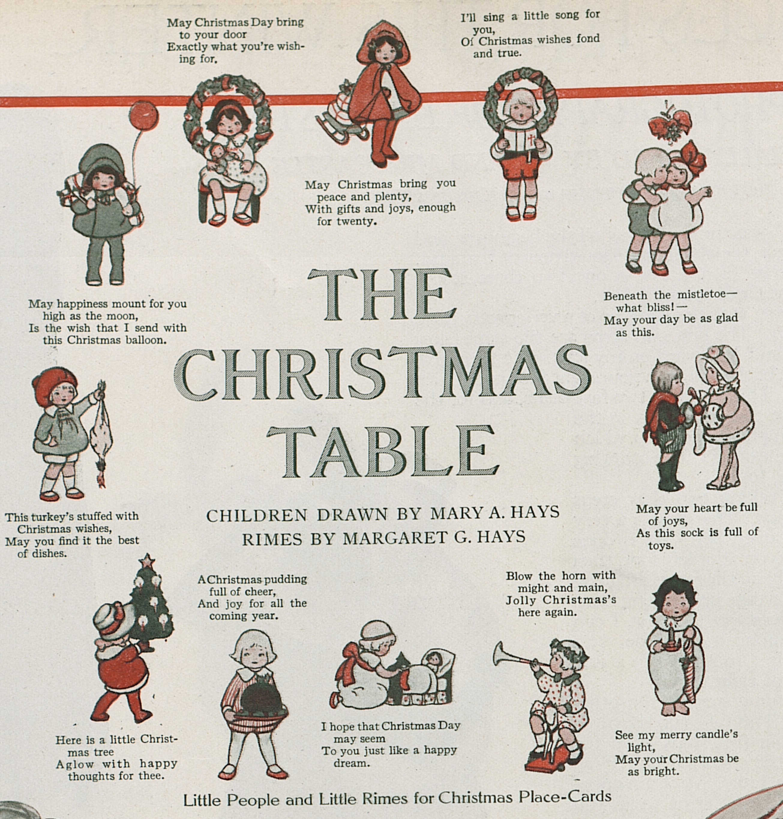 In case you aren’t a creative person, the December, 1914 issue of Ladies Home Journal included twelve “little people and little rimes” that could be cut out and glued onto tag board to make the place cards.