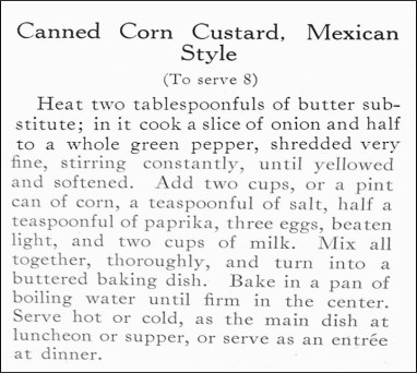 I recently came across a hundred-year-old recipe for Canned Corn Custard, Mexican Style that intrigued me, and – though knowing that canned corn is not trendy – decided to give it a try. Perhaps part of what intrigued me was the claim that this was an internationally-inspired recipe. Was it really Mexican style? – or did the recipe author just think that a humble dish seemed more enticing if it was billed as an internationally-inspired food?