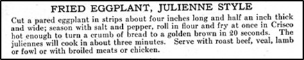 Eggplant is one of those vegetables that I seldom use. I’m often not quite sure how to prepare it, and will pass over it when selecting vegetables to purchase. But I recently saw a really basic Fried Eggplant recipe in a hundred-year-old cookbook and decided to give it a try. Slices of eggplant were breaded with bread crumbs, then fried. It turned out well. The Fried Eggplant slices were crispy and delicious.