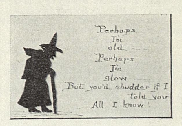 Some rehearsing will be necessary to regulate the lights, as their distance from the curtain determines whether the shadows will be large or small. The last picture must show witches with capes and high-pointed caps, singing weird incantations over a caldron. They are still there when the sheet is drawn aside and the guests rush forward, to recognize in one of them their hostess. As the lights are raised, the tension breaks and the merriment runs high.