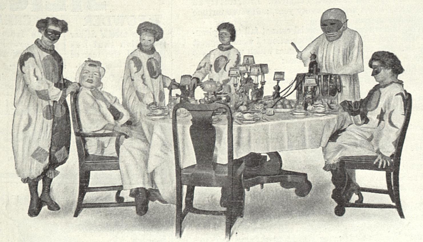 Finally, they come to a large room, dark save for one orange light, where an icy hand takes theirs and leads them to seats. The hand is a glove filled with ice, which the hostess extends. Before the silence becomes oppressive; light appears at the far end of the room behind a sheet. Then begins a shadow pantomime. The real figures are between the light and the sheet, so that the audience sees only their shadows thrown upon the latter.