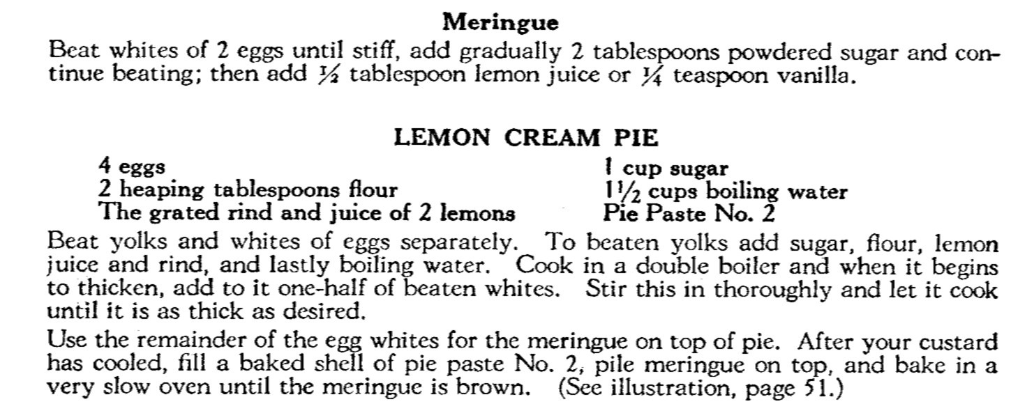 Even though the recipe calls for serving with a Lemon Sauce, there was no Lemon Sauce recipe in the Rumford Cookbook. Maybe the Rumford Cookbook author assumed that the recipe for Lemon Sauce was so basic that there was no need to include it in the book. I found a Lemon Sauce recipe in an old home economics textbook: