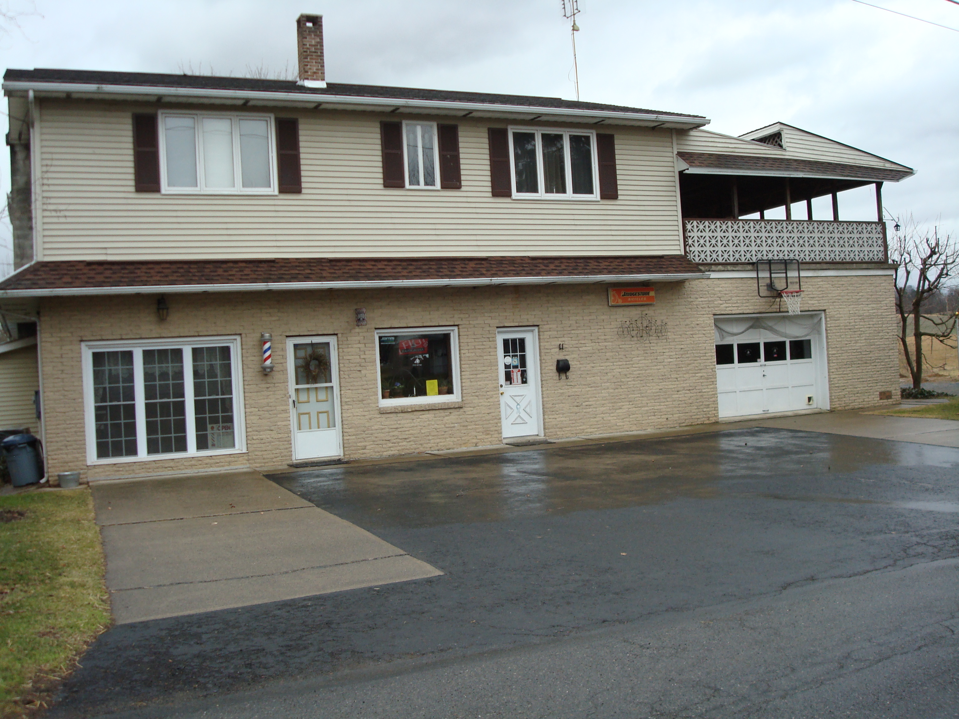 Recent photo of two small businesses in McEwensville–a beauty/barber shop and a bicycle shop.