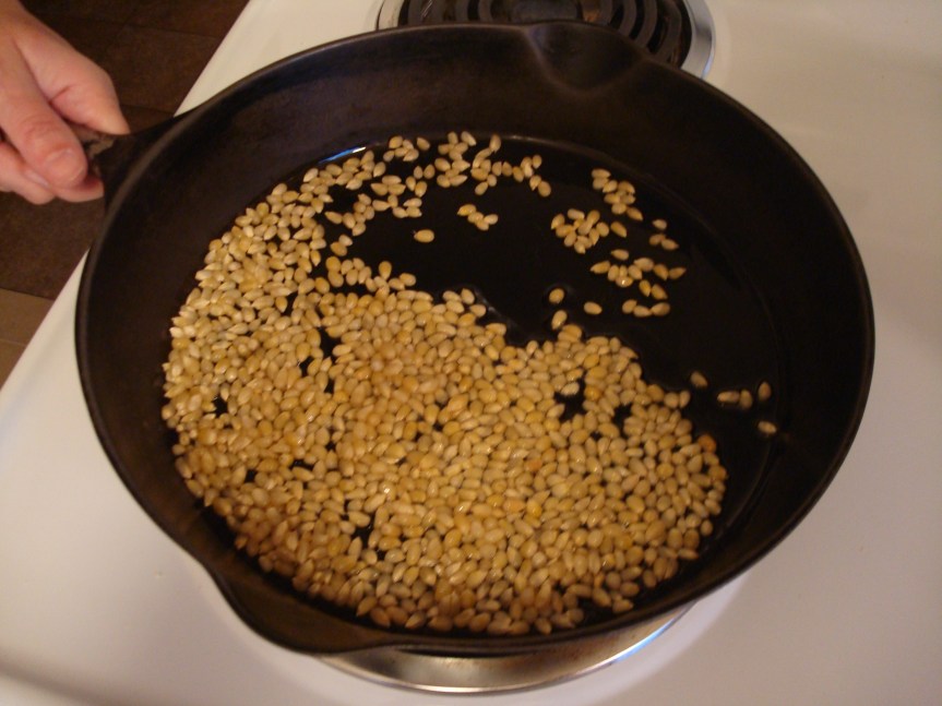 Spread the coated popped corn on the buttered baking sheet or other large pan. After the coated popcorn cools, break (don’t cut) into small pieces. If it will not be used immediately, store in a tightly covered container.