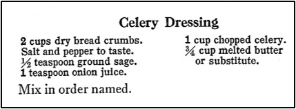 Dressing (or stuffing as I often call it) is one of my favorite parts of the Thanksgiving meal, so when I came across a hundred-year-old recipe for Celery Dressing I decided to give it a try. This recipe makes a bread dressing that is embedded with lots of celery, and is nicely seasoned with sage.