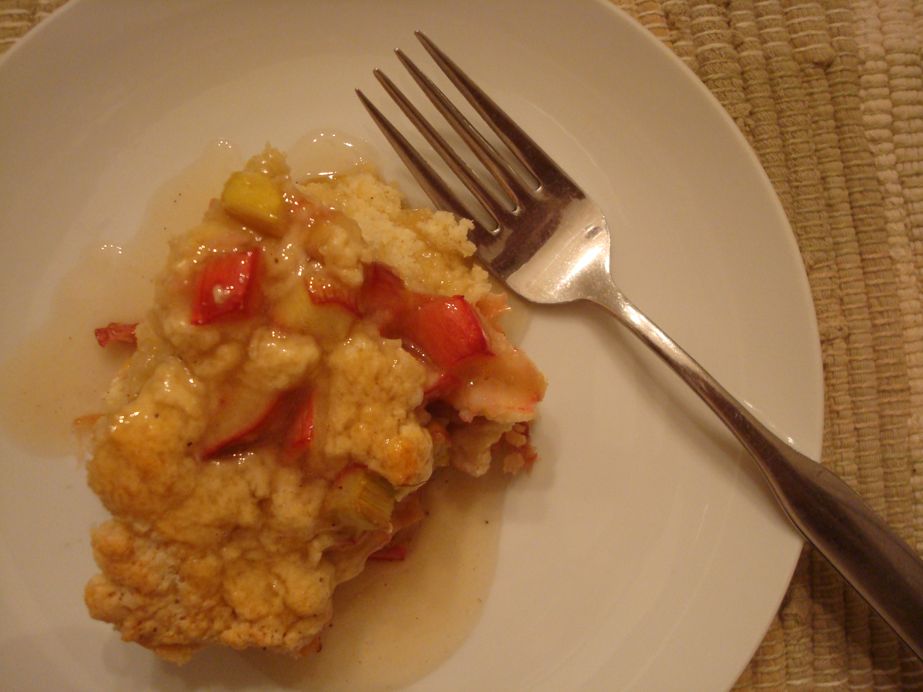The old recipe only called for 1 1/2 cups of rhubarb. When I made this recipe, I had difficulty measuring 2 tablespoons of rhubarb for each dumpling. (Rhubarb is just too thick to fit well on a spoon.) So I used a 1/8 cup scoop, and put a heaping scoop of rhubarb in each dumpling, I ended up running out of rhubarb before I’d used all the shortcake dough, so I cut up an additional stalk of rhubarb. I think in the end that I used 2 – 2 1/2 cups of rhubarb. The dumplings were excellent, though if I made them again, I might put even more rhubarb in each dumpling.