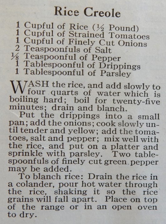Since Rice Creole is supposed to be an inexpensive recipe, I decided to cost it out: 1 cup rice ($0.50), 1 onion ($0.50), 1/4 green pepper ($0.32), 1 can tomatoes ($1.29), salt/parsley/bacon drippings ($0.05) for a total of $2.66. It’s a little more than the 10 cents of days gone by, but considering that a dollar in 1916 is worth $22 today, it’s still an inexpensive dish.